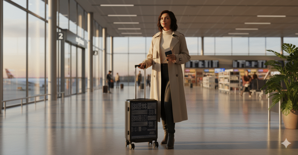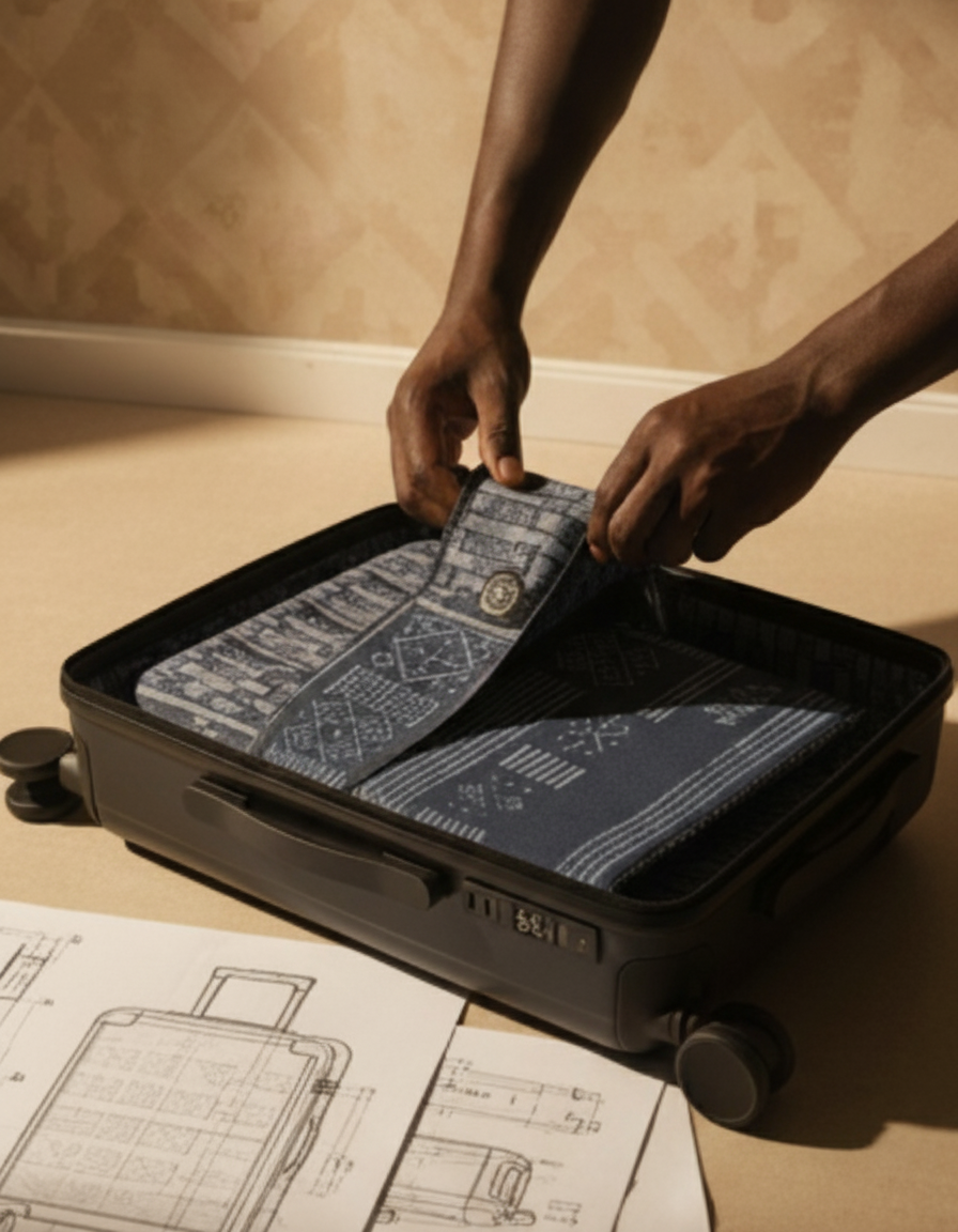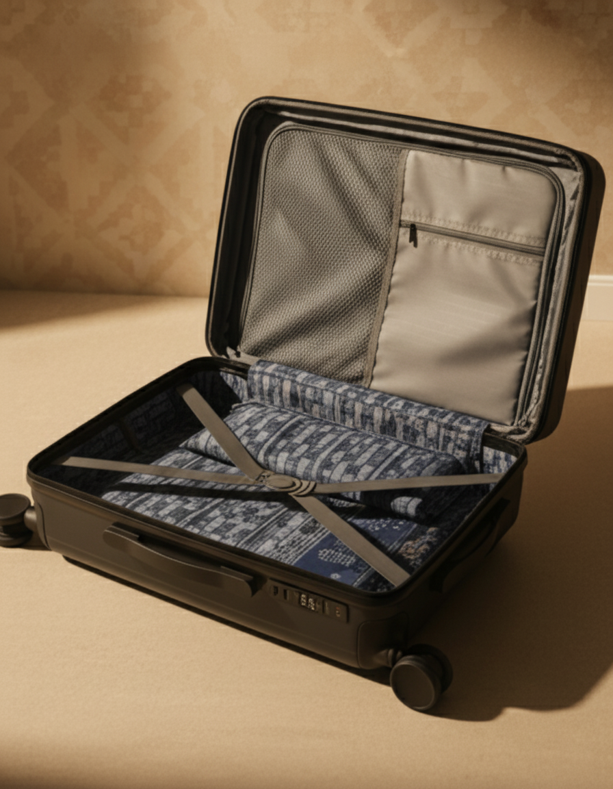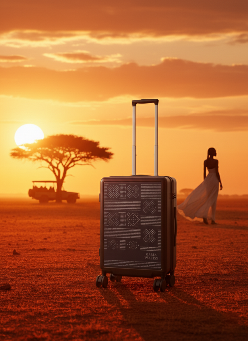 L’intérieur de la valise ouverte révèle un design pensé pour l’efficacité. Le tissu de doublure est orné d’un motif africain subtil. Les sangles de compression réglables et les compartiments zippés assurent que vos affaires restent en place, optimisant l’espace pour un voyage bien organisé.